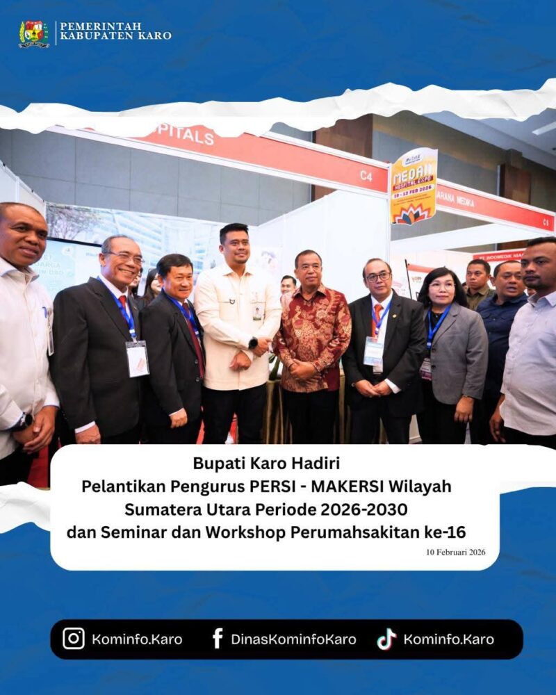 Medan – Bupati Karo, Brigjen Pol (Purn) Dr. dr. Antonius Ginting, Sp.OG., M.Kes., menghadiri kegiatan Pelantikan Pengurus Perhimpunan Rumah Sakit Seluruh Indonesia (PERSI) dan Majelis Kehormatan Etik Rumah Sakit Indonesia (MAKERSI) Wilayah Sumatera Utara periode 2026–2030 yang dirangkaikan dengan Seminar-Workshop Perumahsakitan ke-16, bertempat di Convention 2 Hotel Santika Premiere Dyandra, Medan, Selasa (10/2/2026).