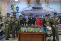 KONFERENSI PERS-Kasatpol PP Demak, Agus Sukiyono bersama jajaran saat Konferensi Pers pengungkapan barang bukti Miras, Cukai Ilegal yang digelar selama 3 hari. (Foto Istimewa)….