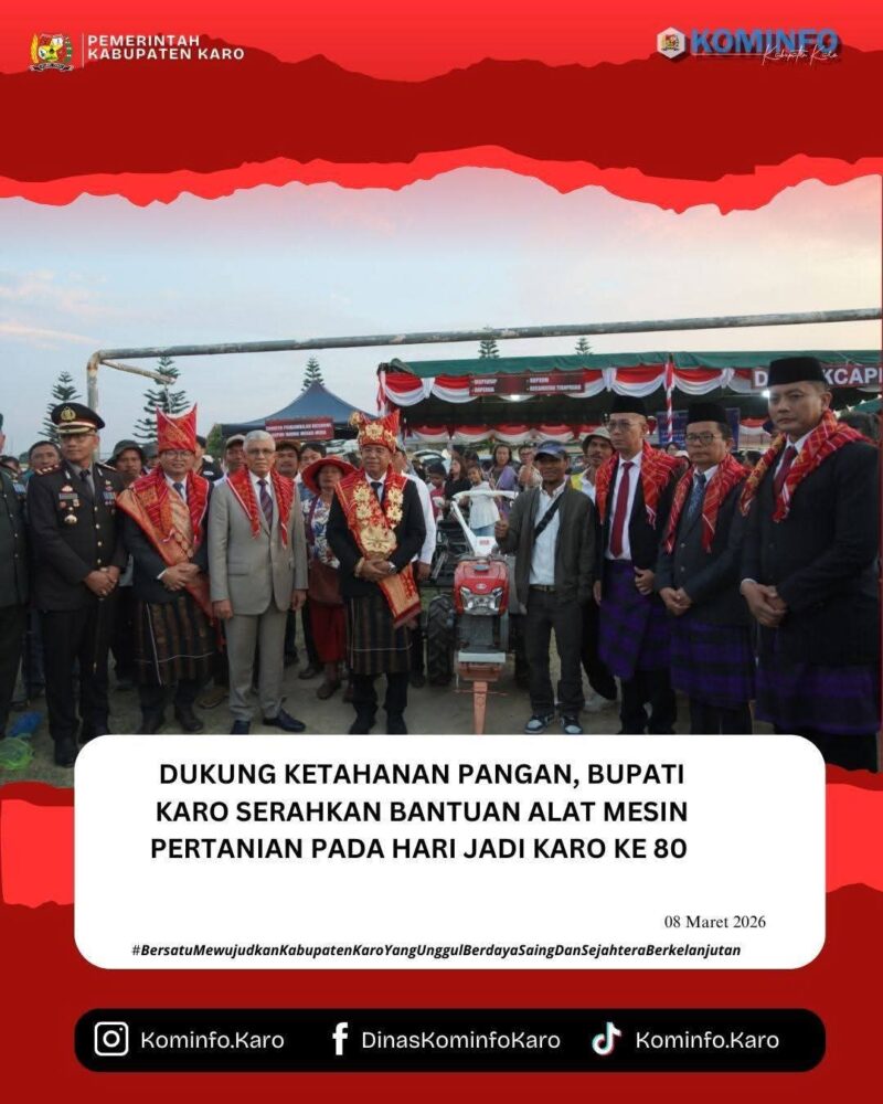 Kabanjahe- Bupati Karo, Brigjen Pol (Purn) Dr. dr. Antonius Ginting, Sp. OG., M.Kes bersama Forkopimda Karo menyerahkan bantuan alat mesin pertanian (Alsintan) kepada enam kelompok tani binaan di Lapangan Samura, Kabanjahe, bertepatan dengan Hari Jadi Kab. Karo ke-80 pada tanggal 08 Maret 2026.