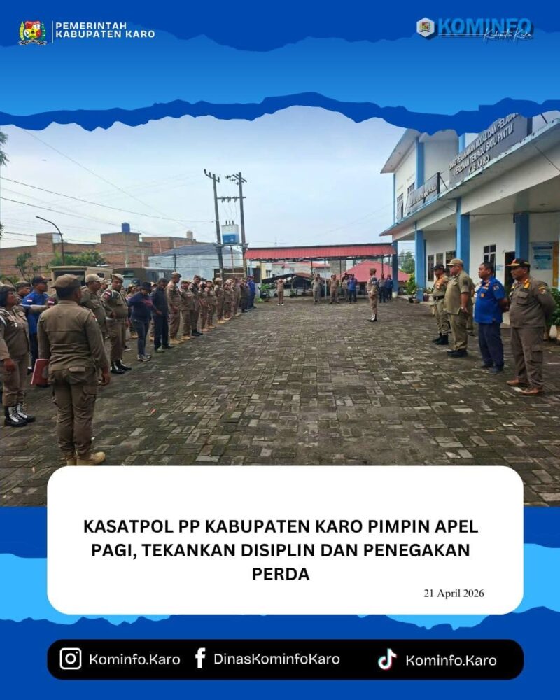 Karo, Selasa, 21 April 2026 — Dalam rangka mendukung pelaksanaan tugas dan fungsi serta mewujudkan visi dan misi Bupati Karo, Brigjen Pol (Purn.) Dr. dr. Antonius Ginting, Sp.OG, M.Kes., Satuan Polisi Pamong Praja Kabupaten Karo melaksanakan kegiatan apel pagi yang dipimpin langsung oleh Kepala Satuan Polisi Pamong Praja Kabupaten Karo, Jon Karnanta Sembiring, S.T., M.Si.