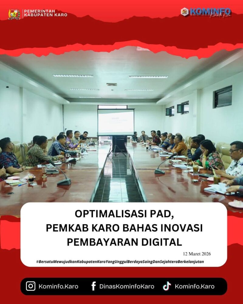 Kabanjahe – Bupati Karo, Brigjen Pol (Purn) Dr. dr. Antonius Ginting, Sp.OG., M.Kes., melalui Sekretaris Daerah Kab. Karo, Gelora Kurnia Putra Ginting, S.STP., MM., memimpin rapat pembahasan optimalisasi Pendapatan Asli Daerah (PAD) melalui digitalisasi pembayaran di Ruang Rapat Matang Sitepu Kantor Bupati Karo, Kamis (12/3/2026).
