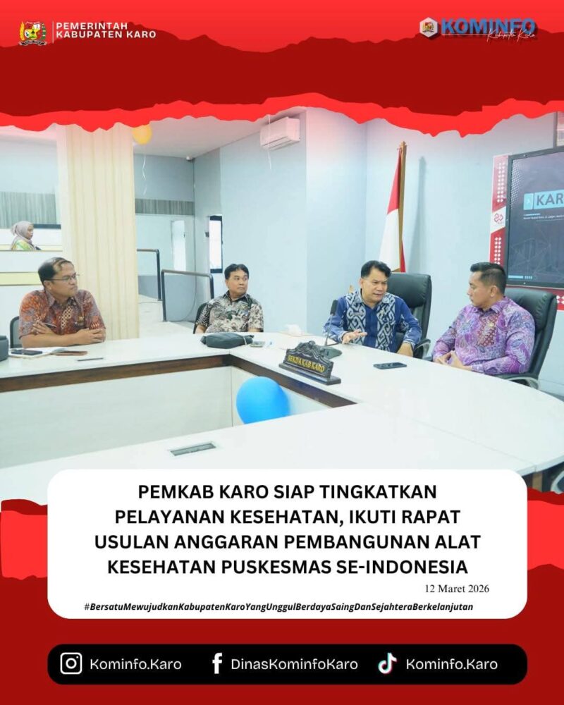 Kabanjahe, 12 Maret 2026 – Bupati Karo Bupati Karo, Brigjen Pol (Purn) Dr. dr. Antonius Ginting, Sp. OG., M.Kes, melalui Sekretaris Daerah Kabupaten Karo Gelora Kurnia Putra Ginting, S.STP, MM hadiri rapat daring Usulan Anggaran Pembangunan dan Penyediaan Alat Kesehatan Puskesmas se-Indonesia yang dilaksanakan oleh Dinas Kesehatan Provinsi Sumatera Utara bertempat di ruang KCC Kantor Bupati Karo.