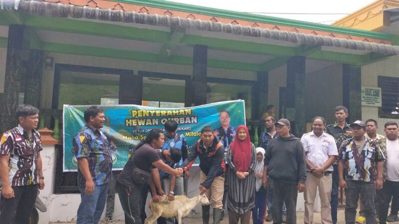 Tanah Karo – Dalam rangka menyambut dan merayakan hari raya Idul Adha 2025, Ketua PC PPM LVRI Kabupaten Karo yang juga menjabat sebagai Wakil Ketua DPRD Kabupaten Karo dari Fraksi Partai Gerindra, Korindo S Milala, bersama Ketua DPD IPK (Ikatan Pemuda Karya) Kabupaten Karo, Maha Sendi S Milala, menggelar kegiatan pembagian hewan kurban di sejumlah masjid yang tersebar di wilayah Kabupaten Karo, Kamis (6 Juni 2025).